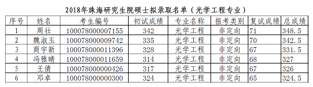 2018年珠海研究生院硕士拟录取名单(光学工程专业)