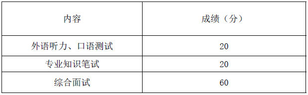 复试成绩实行百分制,复试成绩低于60 分者不予录取,具体成绩分数组成见下表。