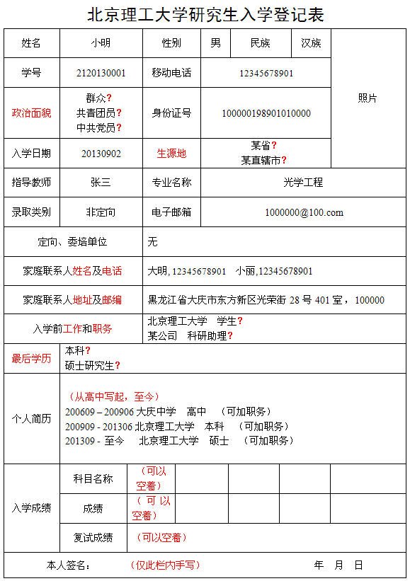 2、政治面貌、家庭联系人姓名、电话、联系地址及邮编、移动电话、电子邮箱:请据实填写。
