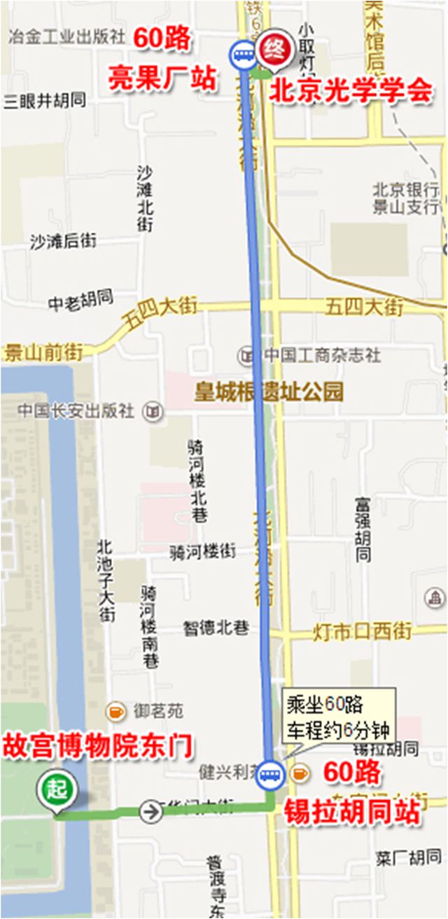 4).由于进入天安门城楼实行单向参观,无法按原路返回,请大家参观完天安门城楼后,沿出口方向向北行至故宫博物院东门,再向东行约200米至马路东60路或82路公交车锡拉胡同站,乘3站地至亮果厂站下车、横穿皇城遗址公园即可抵达北京光学学会。