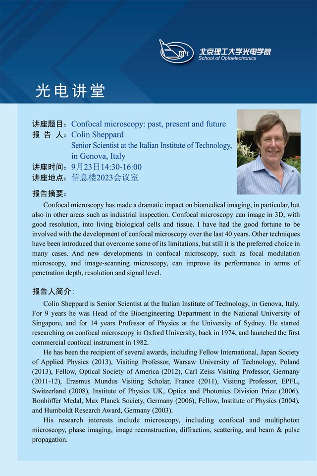 通知公告 通知公告 首页» 通知公告» 学院通知 【讲座预告】Sheppard教授学术讲座 发布日期:2014-09-17 阅读次数: 国际首台商用共焦显微镜的构建者及其理论体系的建立者Sheppard教授来mg4355官网进行学术讲座 分享到:
