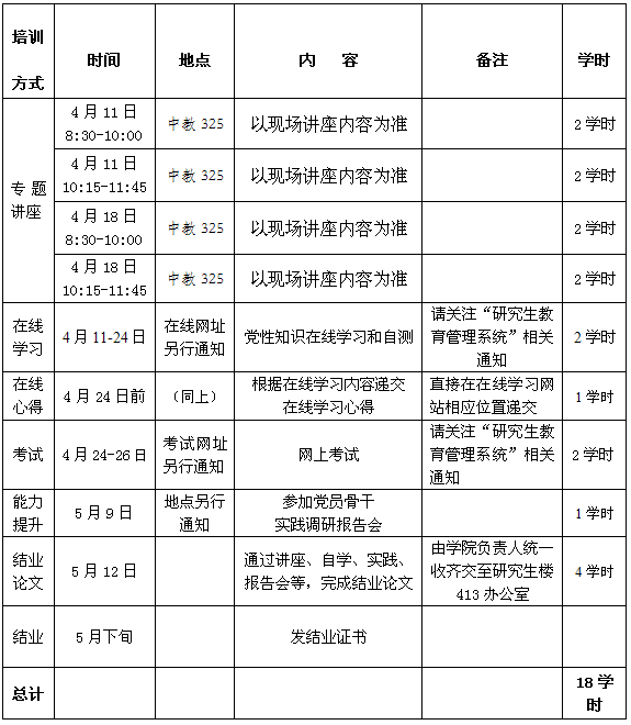 5、研究生党课培训共计18学时,其中,网上考试(2学时)和结业论文(4学时)为必修环节,任何一项不合格不予结业;其余12学时中,需修满10学时方可结业;